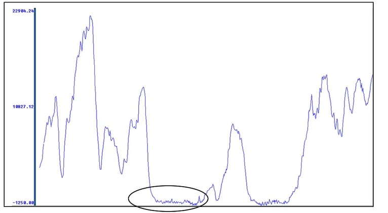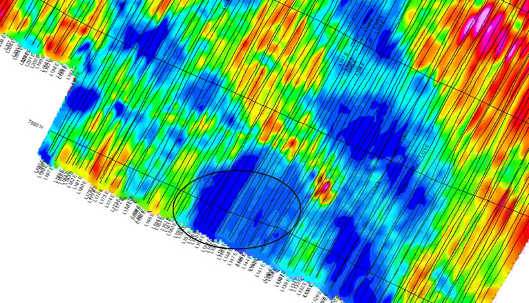 The image below, is a grid from a TDEM dataset. Let's look at the circle region. It seems near the southern survey boundary that there is a small levelling issue.